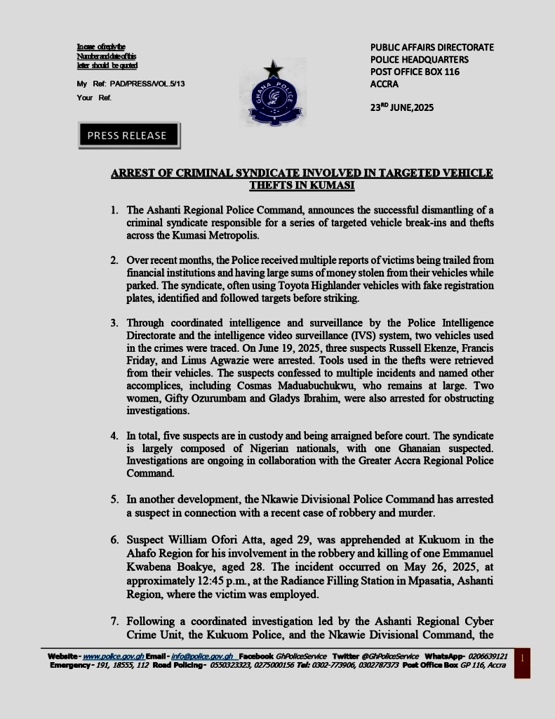 According to the Ashanti Regional Police Commander, DCOP Emmanuel Teye Cudjoe, the suspects followed their victims after they withdrew large amounts of money from financial institutions. The gang would then break into the victims’ cars and steal the cash. These robberies have been happening over the past month.